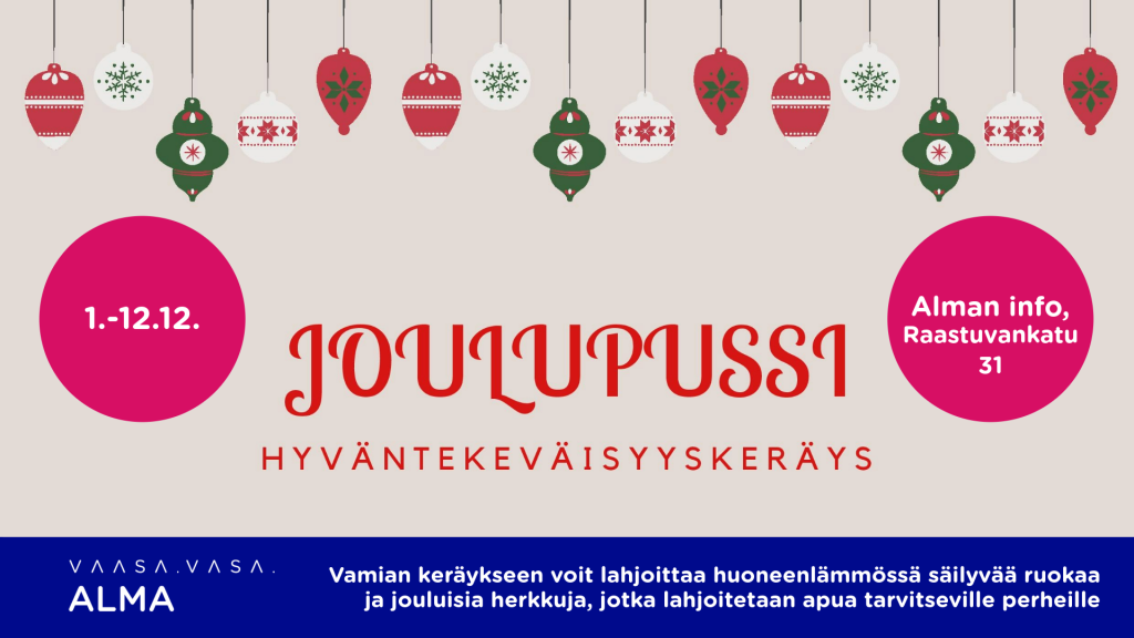 Alma osallistuu Vamian merkonomiopiskelijoiden järjestämään JouluPussi -hyväntekeväisyyskeräykseen.
