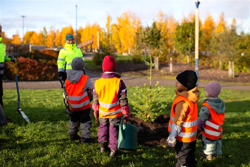 Malmöntalon päiväkotilaiset pääsivät istuttamaan puita Onkilahden toimintapuistoon