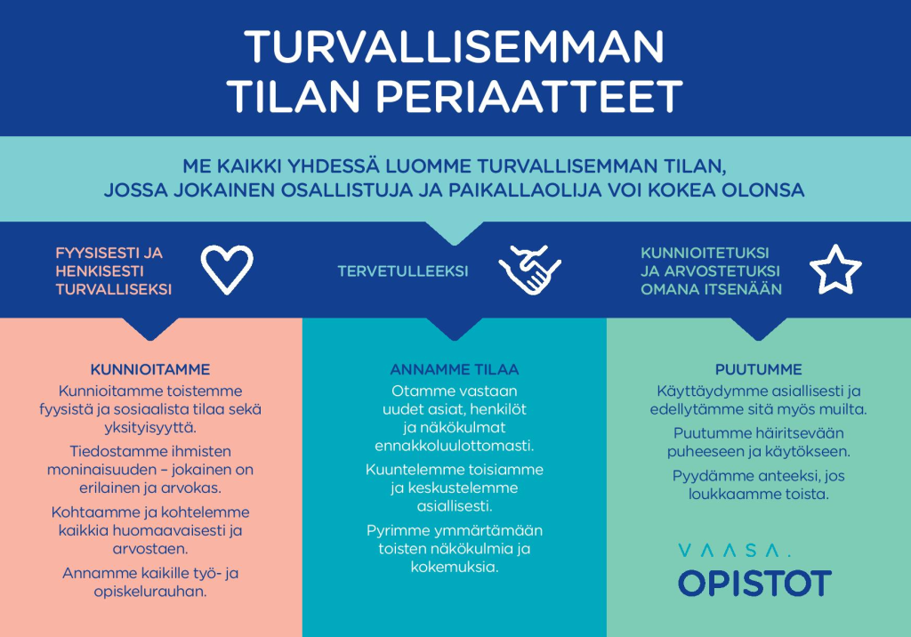Vaasan kaupungin opistojen toiminnassa on käytössä turvallisemman tilan periaatteet. Turvallisella tilalla tarkoitamme ympäristöä, jossa jokainen osallistuja ja paikallaolija voi kokea olonsa kunnioitetuksi ja arvostetuksi omana itsenään.