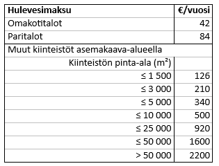 Hulevesimaksu peritään kaikilta rakennetuilta kiinteistöiltä asemakaavoitetulla alueella niiden pinta-alan ja käyttötarkoituksen perusteella. Hulevesimaksun määrä on riippumaton kiinteistökohtaisista hulevesiratkaisuista.