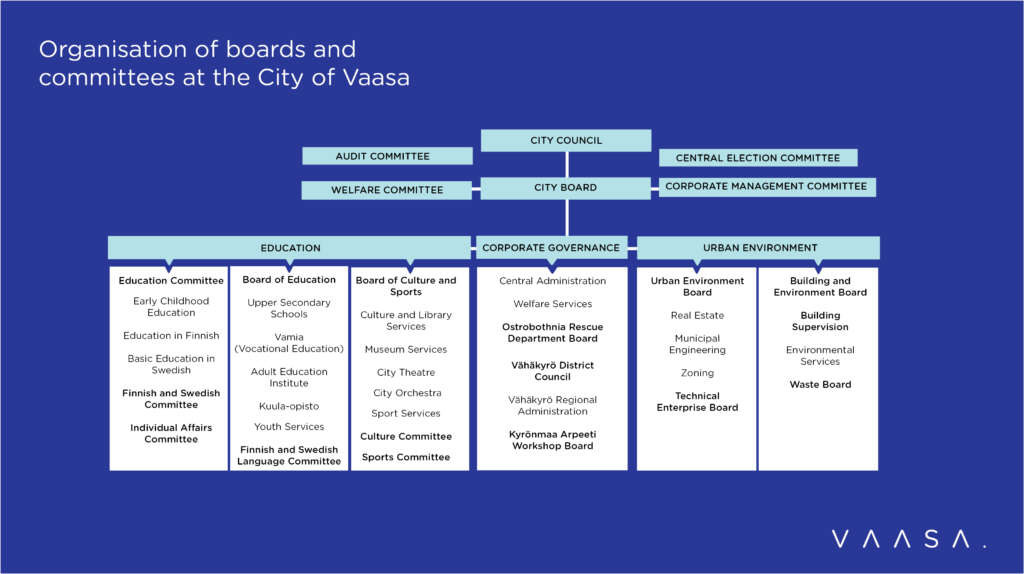 The city council appoints the city board, which manages the city administration and prepares matters for the council. Vaasa also has several committees and executive boards. They oversee and supervise operations within their areas of responsibility. The organisation of the City of Vaasa is made up of an educational sector, a technical sector, a social services and healthcare sector and a central administration.