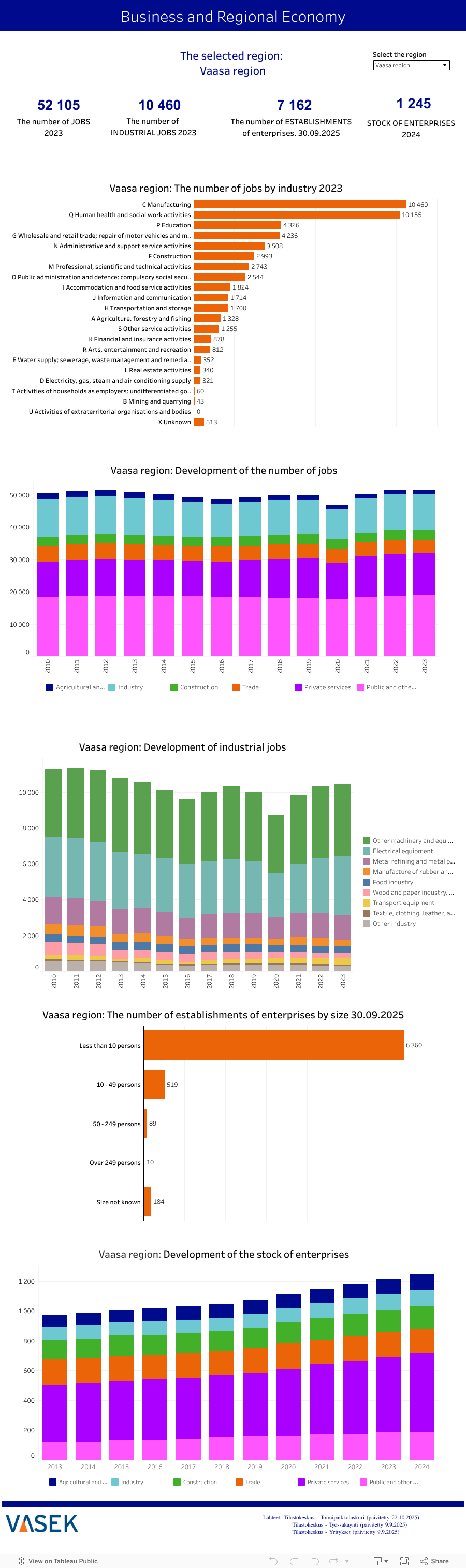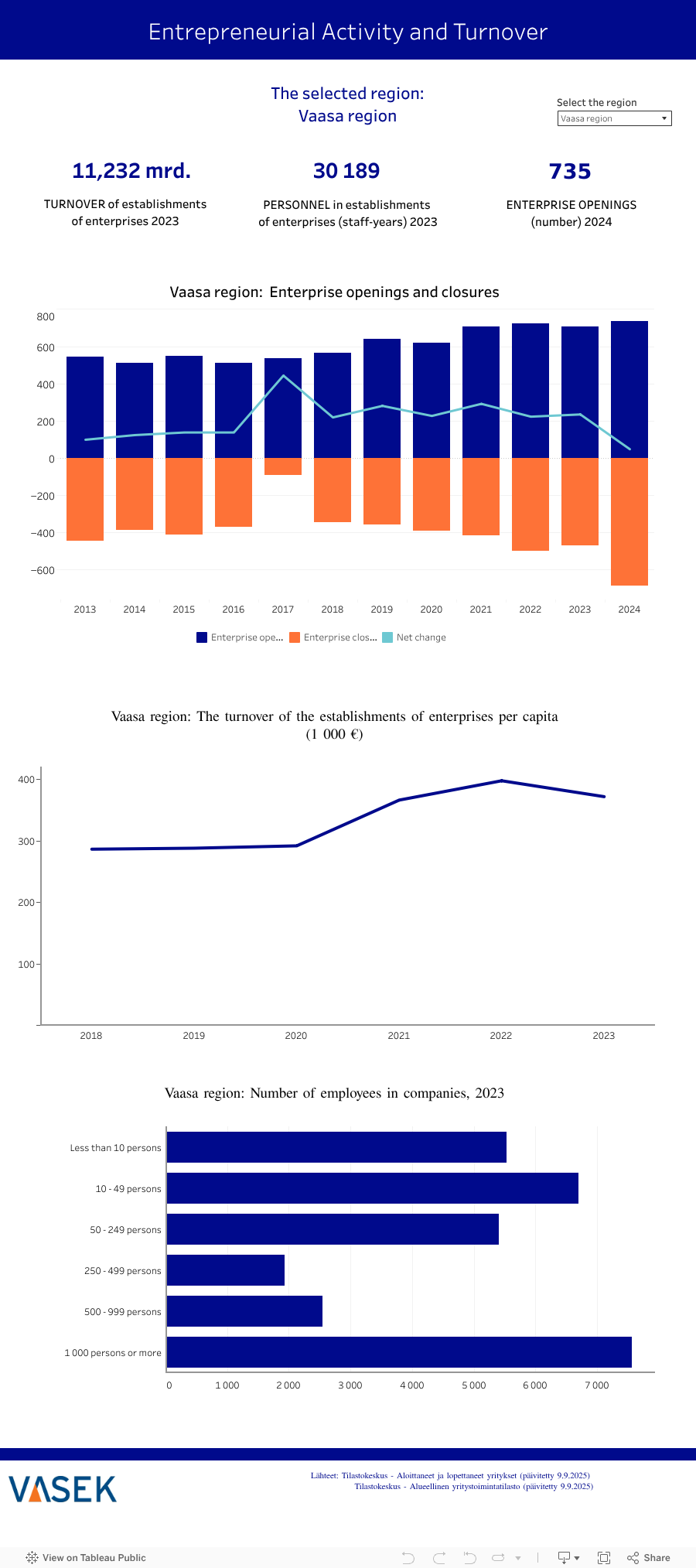 The statistics show, for example, the number of jobs by industry and size class. The relation between the number of new companies and closures of companies in the Vaasa region is positive. In the region, there is a continuous trend of more companies being established than closed, which has helped to keep the number of jobs high.