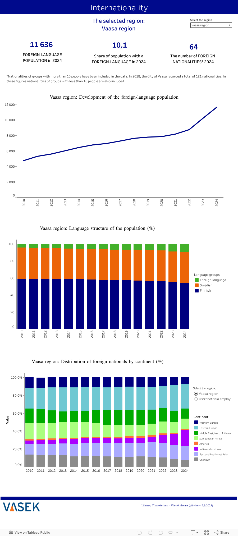 Vaasa region is one of Finlands most multilingual and international regions. During the 21st century the share of the international population has been increasing fast. We speak almost a hundred different languages, and the population includes 120 different nationalities (statistics from the city of Vaasa, which includes groups of under 10 people). In addition to statistics, internationality is also reflected in workplaces, schools, kindergartens, hobbies and, of course, in the street scene.