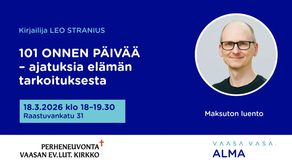 Kaikille avoin ja maksuton 101 onnen päivää – ajatuksia elämän tarkoituksesta -luento pidetään Vaasan kansalaisopisto Almassa keskiviikkona 18.3.2026 klo 18–19.30, Raastuvankatu 31, juhlasali A318, 3. kerros. Luento pidetään suomen kielellä.