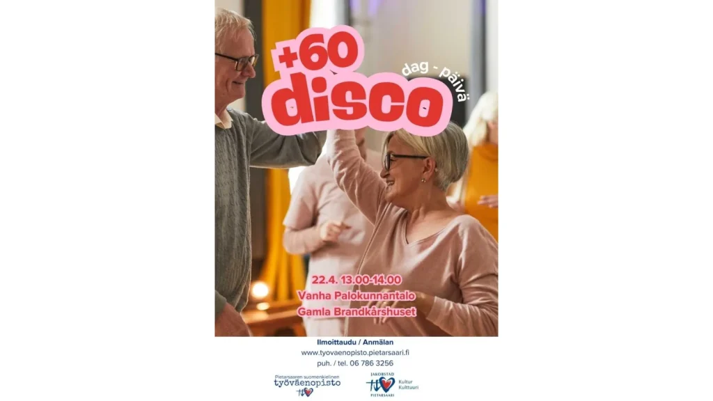 Tule nauttimaan yhdessäolosta ja tanssin ilosta! Laitetaan jalat liikkeelle takavuosien hittien tahdissa. Tapahtuma on ilmainen ja avoin kaikille, joiden tanssijalkaa vipattaa. Ilmoittaudu mukaan: https://tyovaenopisto.pietarsaari.fi/kurssit/nayta/7486-000003-60-paivadisco tai soita 06 786 3256.