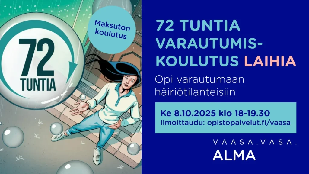 Kansalaisopisto Alma tarjoaa syksyllä 2025 ajankohtaista ja tärkeää tietoa kotitalouksien varautumisesta järjestämällä kaikille avoimen ja maksuttoman 72 tuntia varautumiskoulutus -yleisöluennon.