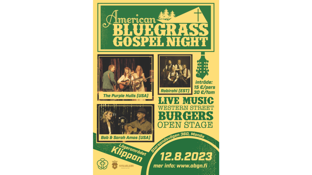 Lördag 12.8.2023 genomförs den femte upplagan av American Bluegrass Gospel Night på Klippan i Monäs, Nykarleby.