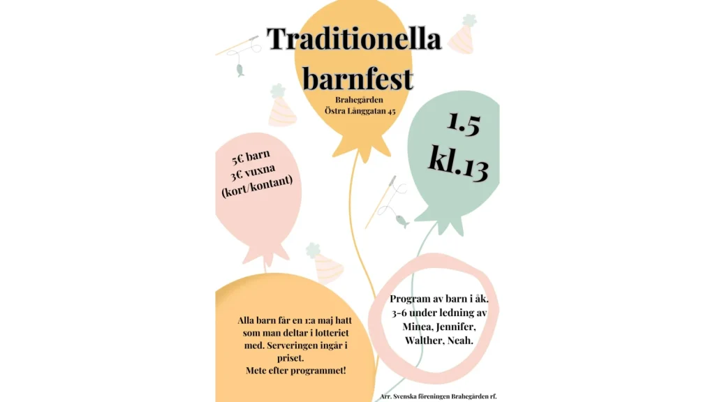 Välkommen på Brahegårdens traditionella barnfest! Festen hålls 1.5 med start kl. 13.00. Program av barn i åk. 3-6 under ledning av Walther, Minea, Neah och Jennifer.😊