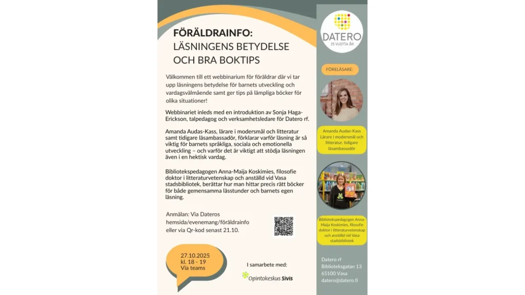 Ett webbinarium för föräldrar där vi tar upp läsningens betydelse för barnets utveckling och vardagsvälmående