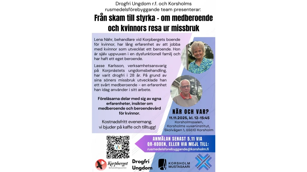 Välkommen på en föreläsningseftermiddag med behandlare från Korpbergets behandlingscenter (sve). Dagen ordnas av Drogfri Ungdom rf. och Korsholms kommuns rusmedelsförebyggande team.