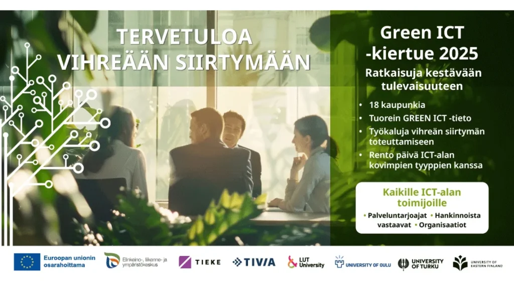 The autumn tour kicks off on September 30 in Rovaniemi and will visit nine more cities across Finland during 2025. Sign up for the green transition event in the ICT sector and be part of the change. The tour events include keynote speeches, case examples, and interactive sessions – not to mention refreshments.