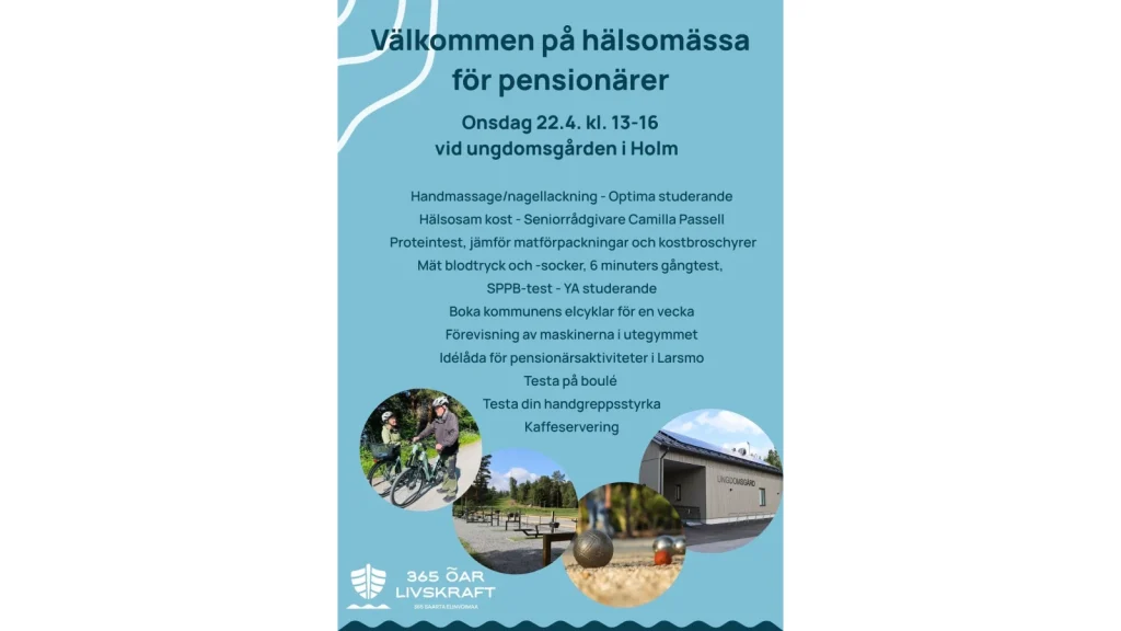 Onsdagen den 22 april kl. 13-16 ordnas en hälsomässa för pensionärer i Larsmo.