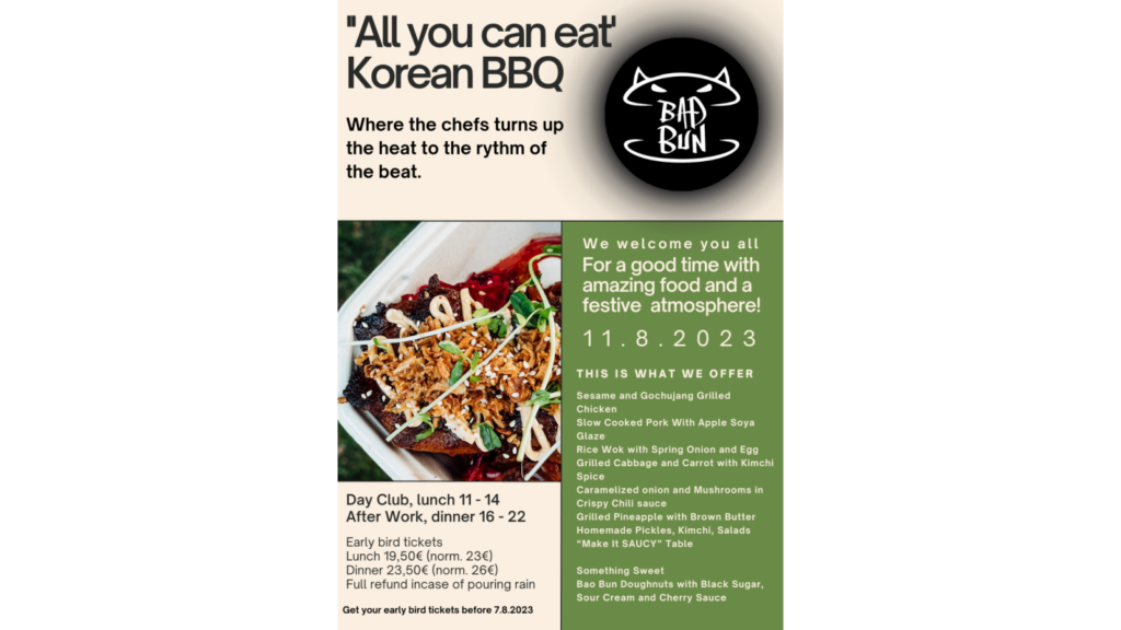 ALL EARLY BIRD TICKES AND RESERVATIONS have to be made first via email, Facebook or Instagram. Pick up and payment of tickets happens at Bad Bun at latest 7.8.2023