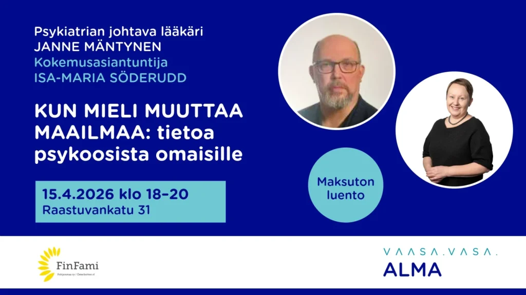 Kun mieli muuttaa maailmaa -luennolla saat arvokasta tietoa psykoosista erityisesti omaisten näkökulmasta. Tilaisuudessa luennoivat Pohjanmaan hyvinvointialueen psykiatrian johtava lääkäri Janne Mäntynen ja kokemusasiantuntija Isa-Maria Söderudd, jotka yhdessä tarjoavat syvällisen ja moniulotteisen katsauksen aiheeseen.