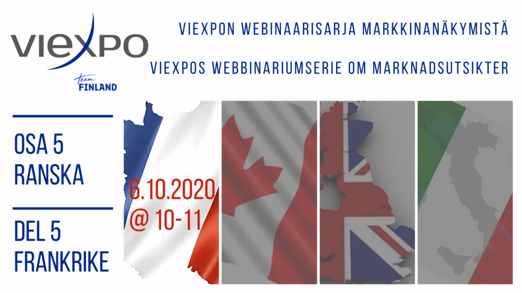 Webbinarieserien börjar med marknadsutsikter i Frankrike 6.10. kl. 10–11. På kommande är också marknadsutsikter i Kanada 20.10 kl. 15–16 och marknadsutsikter i Storbritannien 3.11 samt marknadsutsikter i Italien 10.11. kl. 10–11.