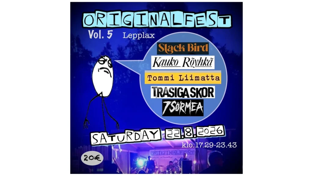 On Saturday 22.8.2026 we will once again arrange a small festival in Lepplax/Pedersöre. The artists this year are Kauko Röyhkä, Tommi Liimatta, SlackBird, 7Sormea, and Trasiga Skor. More information on www.originalfest.fi