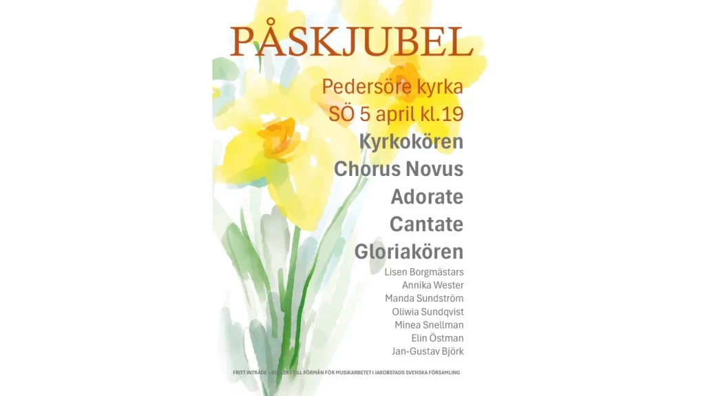 Välkommen till Pedersöre kyrka på påskdagen och lyssna på Jakobstads svenska församlings körer som framför påskens psalmer och sånger tillsammans med orgelelever från församlingens musikskola och församlingens kantorer. Medverkande är manskören Adorate, damkören Gloriakören, Cantate, Kyrkokören och Chorus Novus. Övriga medverkande är Manda Sundström, Oliwia Sundqvist, Minea Snellman, Elin Östman, Lisen Borgmästars, Annika Wester och Jan-Gustav Björk.