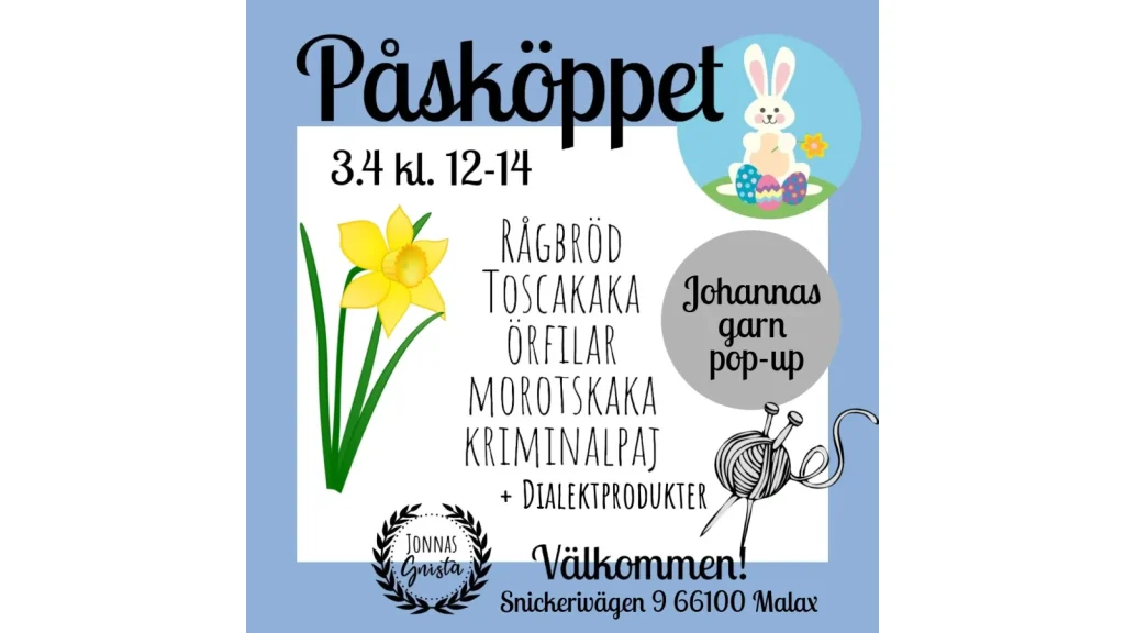 Välkommen på påsköppet i Jonnas Gnistas gårdsbutik. Köp hem bakverk och dialektprodukter. Johannas garn ordnar pop-up och säljer handfärgat garn.