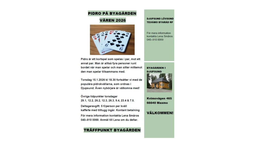 Pidro är ett spännande och socialt kortspel som spelas i par mot ett annat par. Man är alltså fyra personer runt bordet när man spelar. Även om spelet spelas i par går det utmärkt att komma ensam – på plats hittar man någon att spela tillsammans med. Även nybörjare är välkomna med!