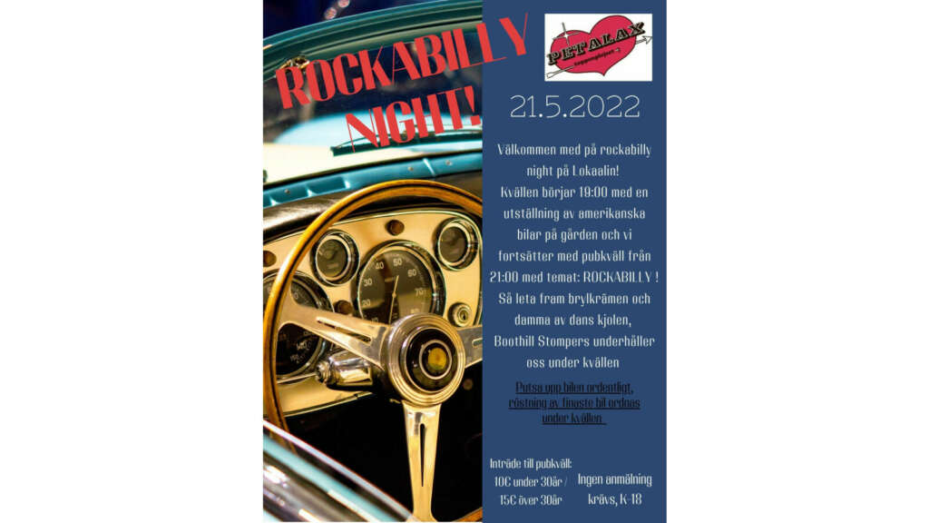 Utställning av amerikanska bilar sker på gården vid Lokaalin 19.00 där alla är välkomna! 21.00 drar pubkvällen igång med temat Rockabilly och Boothill Stompers står för underhållningen under kvällen. K-18 under pubkvällen!