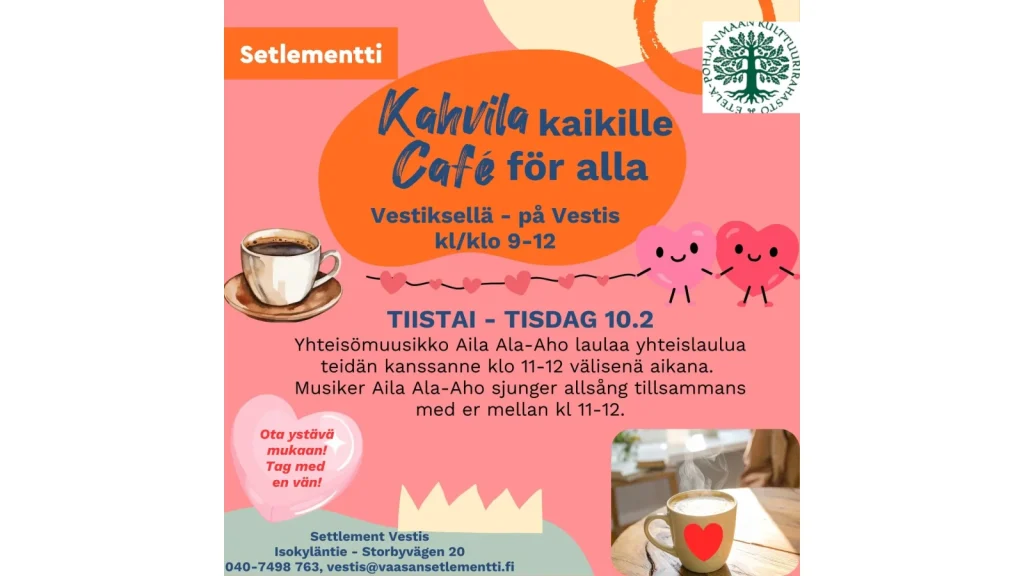 Yhteisömuusikko Aila Ala-Aho vierailee Setlementti Vestiksen Kaikkien kahvilassa ja laulaa kävijöiden kanssa yhteislauluja. Ota mukaan ystäväsi ja tule viettämään ystävänpäivää jo vähän etukäteen.