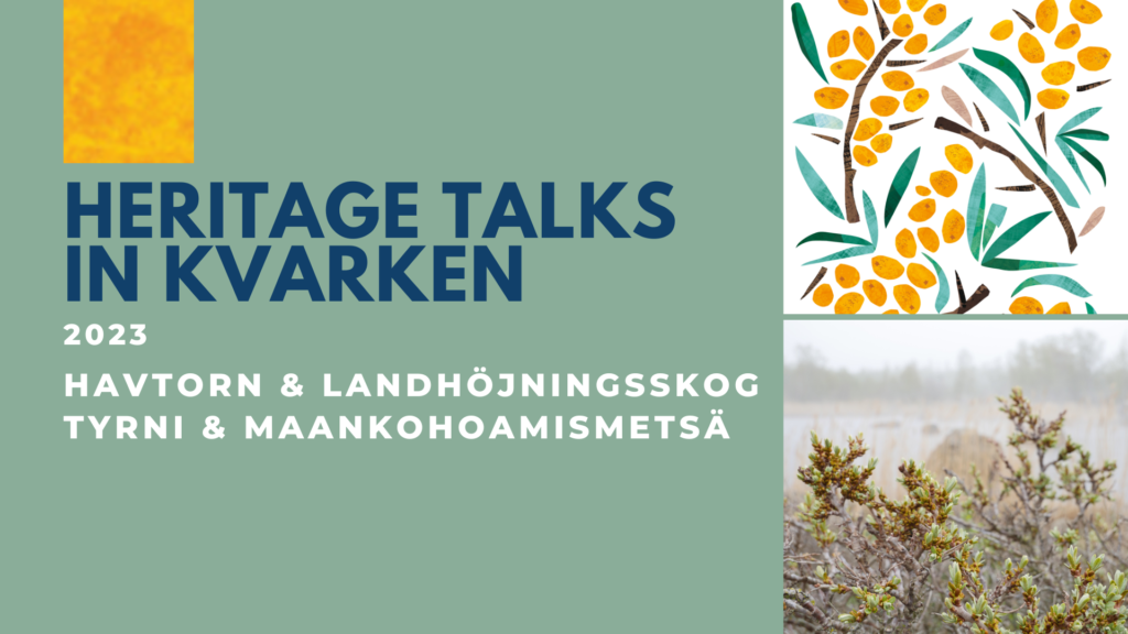 Helmikuussa 2023 ystävänpäivän viikolla järjestettiin ensi kertaa Merenkurkun saariston maailmanperinnön uusi verkkoluentokonsepti, Heritage Talks in Kvarken! Vuoden 2023 luentojen taustateemana on tyrni ja maankohoamismetsä. Lue lisää pudotusvalikosta alta vuoden 2023 Heritage Talkseista! Helmikuun 2023 Heritage Talksit järjesti opetus- ja kulttuuriministeriön rahoittama ja Merenkurkun maailmanperintö ry:n vetämä Luova Merenkurkku -hanke.