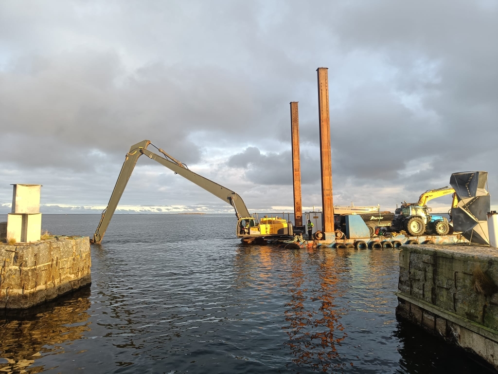 -Aallonmurtajien päädyt on jo purettu, ja seuraavaksi rakennetaan uudet aallonmurtajat luonnonkivistä. Viimeistelynä murtajien päälle asetellaan puretut muurinkivet. Satama ruopataan, kun aallonmurtajat ovat valmiit, kertoo Metsähallituksen Teemu Rauhala.