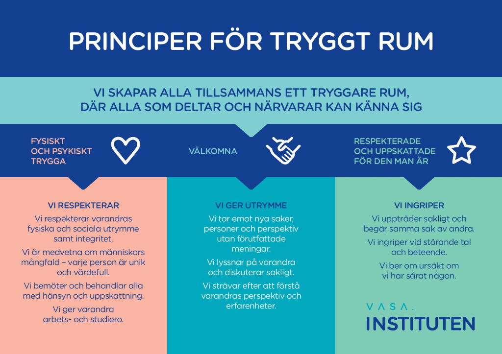 I verksamheten vid Vasa stads institut tillämpas principerna för ett tryggare utrymme. Med tryggare utrymme menar vi en miljö där varje deltagare och närvarande person kan känna sig respekterad och uppskattad för den hen är.