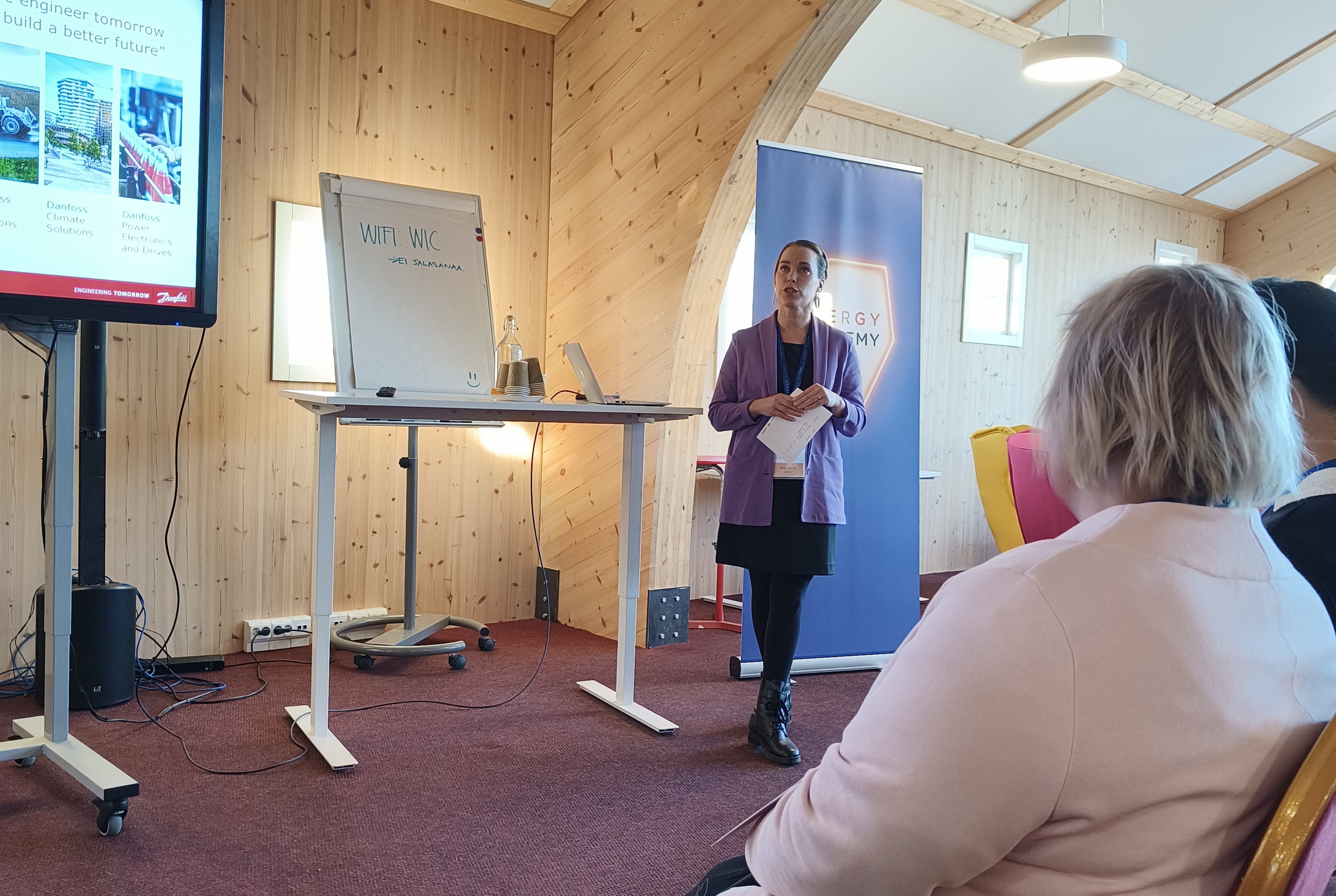 Tillfället inleddes med välkomsthälsningar från Vasa stad och från VAMK. Cecilia Raunio, Ekonomi- och strategidirektör vid Vasa stad, berättade om stadens koldioxidneutralitetssatsningar, om Nordens energihuvudstad och lyfte framför allt upp studerandenas viktiga roll i den globala energiomställningen.