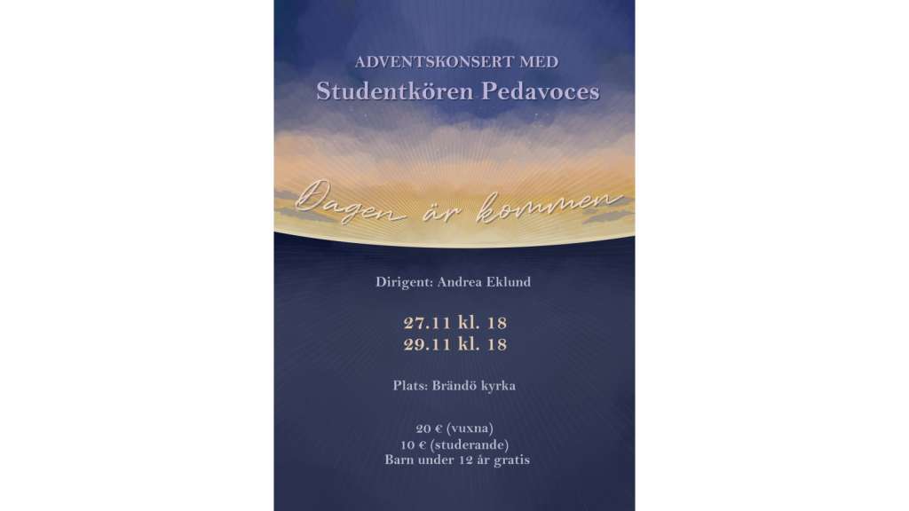 Pedavoces ordnar adventskonserter i Brändö kyrka 27.11 och 29.11. Pris: 10/20 €. Dirigent: Andrea Eklund.