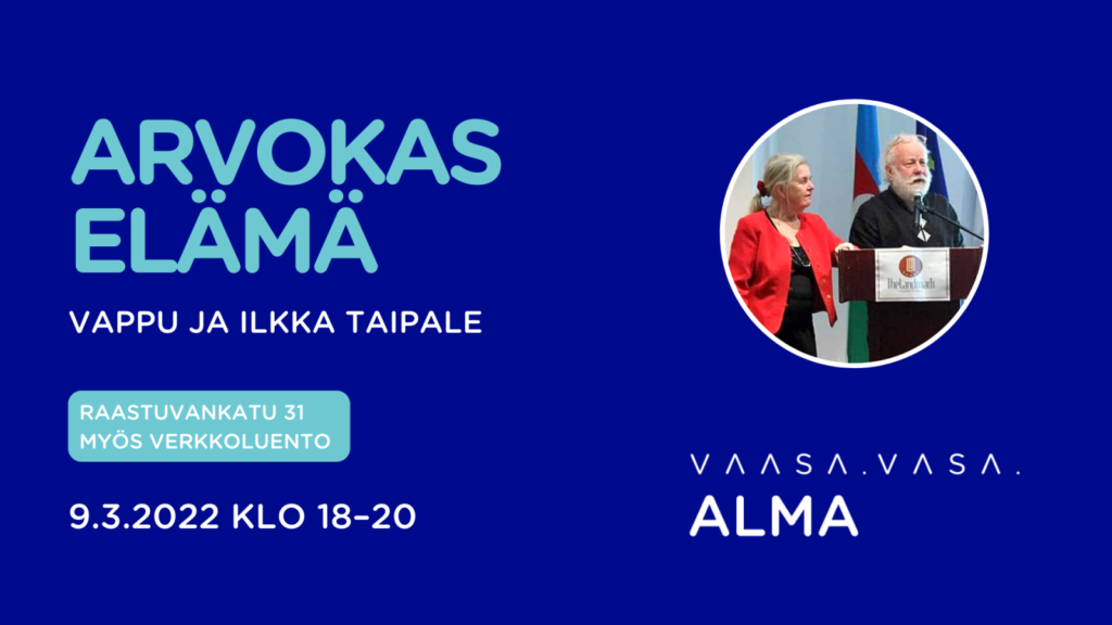 Millaista on arvokas ja hyvä elämä ihmisen eri ikävaiheissa? Lääketieteen tohtorit ja pitkän linjan yhteiskunnalliset vaikuttajat Vappu ja Ilkka Taipale käsittelevät yhteisluennossaan hyvän ja arvokkaan elämän peruspilareita lapsuudesta ihmisen vanhenemiseen saakka.