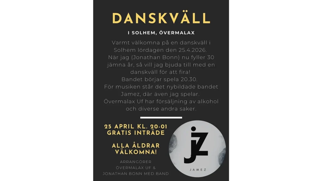Kvällen arrangeras som samarbete mellan Övermalax Uf och Jonathan Bonn, som vill bjuda byn (givetvis även utbyss!) på en danskväll med gratis inträde!