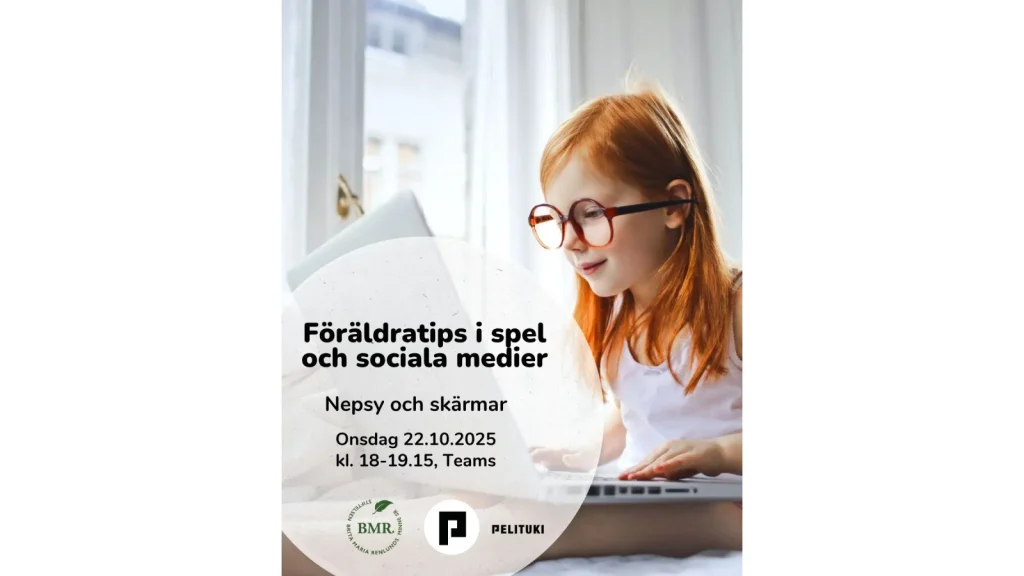 Föräldratips ordnas en gång i månaden av projektet ”Välmående barn och familjer i en digitaliserad vardag” i samarbete med Pelituki. Verksamheten understöds av Stiftelsen Brita Maria Renlunds minne.