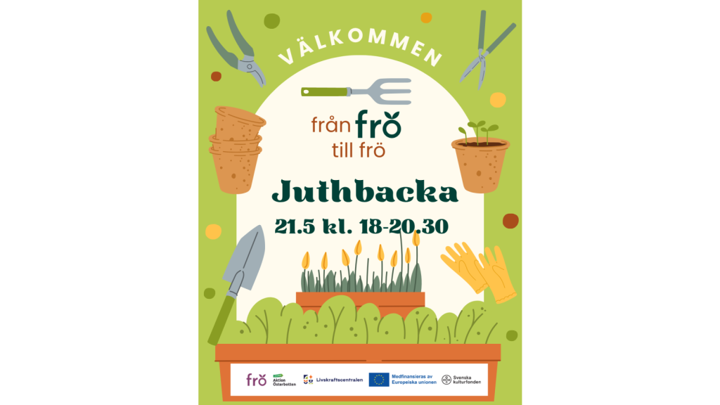 Från FRÖ till frö arrangeras i samarbete mellan projektet FRÖ, Flyktingvännerna, Nykarleby 4H och Juthbacka stiftelsen. Den 21 maj 2026 kl. 18–20.30 samlas vi vid Juthbacka i Nykarleby för att mötas över gränser och låta både idéer och vänskap gro.