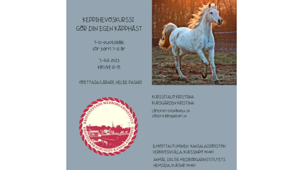 Kursen är för barn 7-12 år. Kom och tillverka en käpphäst enligt egna mått och enligt din ålder. Hur ser din häst ut? Vi börjar med att fundera ut, rita och måla den hästen du vill ha. Hästen kan också vara en fantasifigur t.ex. från sagovärlden. Hästen kan tillverkas av till exempel yllesockor som finns bland de avlagda textilier därhemma. Du kan också ta med små barnvantar av ylle som inte längre används, ifall det finns sådana därhemma. I stället för yllesockor kan vi även använda en gammal ylletröja i vuxenstorlek. De avlagda textilierna kan ha vilken färg som helst, för vi kan färga om dem på kursen. Vi håller en paus då barnen kan äta sin medhavda matsäck. Välkomna på kursen!