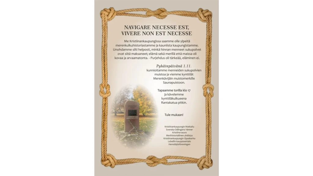 Vi i Kristinestad kan vara stolta över vår sjöfartshistoria och vår vackra stad. Vi glömmer ändå lätt, hur hårt och oförutsebart de gångna generationernas liv på både på havet och landbacken var. På allhelgonadagen 1.11 hedrar vi gångna generationers minne och ta varsitt ljus till Sjöfararnas minnesmärke i Badhusparken. Vi träffas på torget kl. 17.00 och går som kortege med tända ljus längs Strandgatan till Badhusparken. Kort program vid minnesmärket. Ljus kan föras till minnesmärket fram till 6.1 2026.