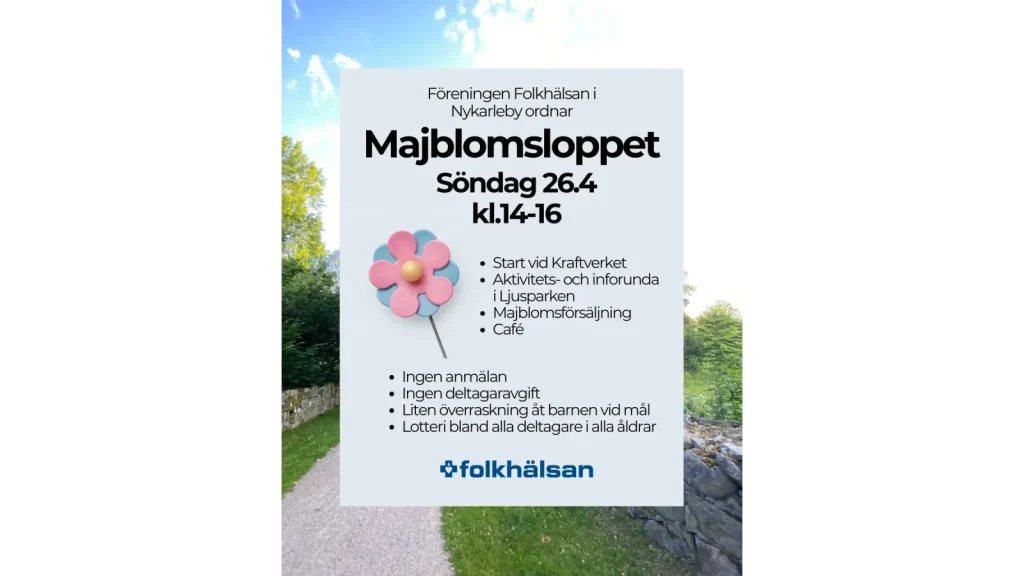 Häng med på en aktivitets och infobana runt i Ljusparken i Nykarleby söndagen den 26.4 kl. 14-16. För alla mellan 0-115 år. Gratis deltagande med start och mål vid kraftverket. Överraskning åt alla barn vid målgång och lotteri bland alla vuxna deltagande. Majblomsförsäljning och café. Välkommen!