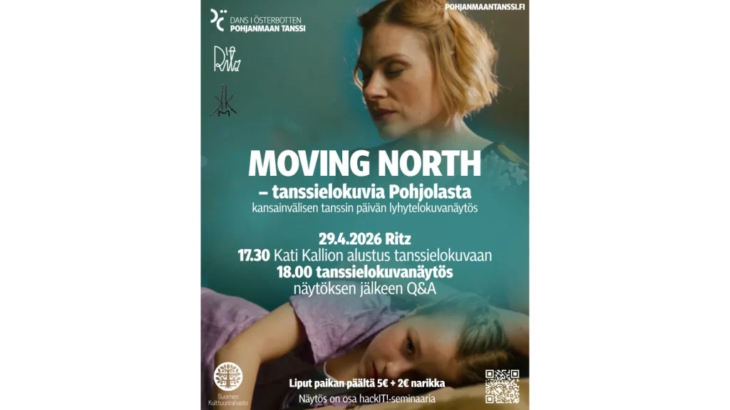Kati Kallio har återigen kurerat en fantastisk och mångsidig MOVING NORTH-dansfilmsvisning för oss. På den internationella dansdagen – onsdagen den 29.4.2026 – dyker vi in i dansfilmer som får oss att reflektera över olika ritualer, våra vanor och begreppet död.