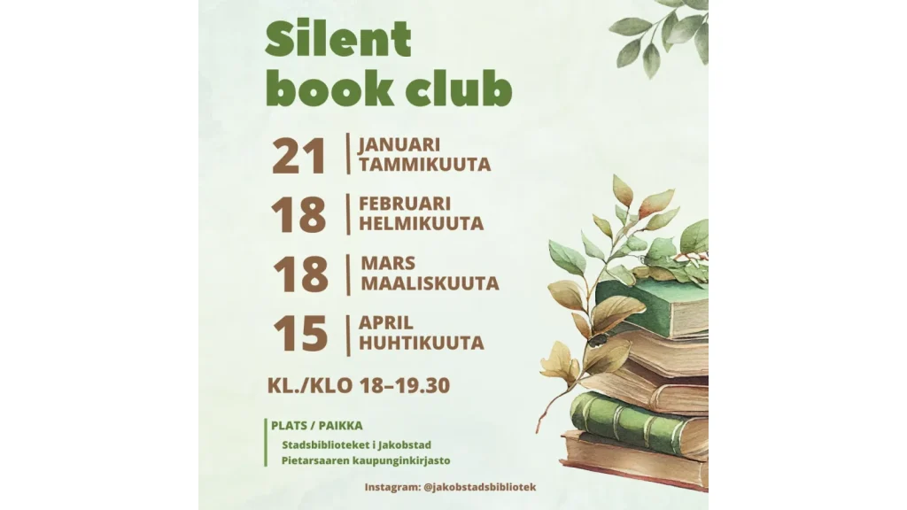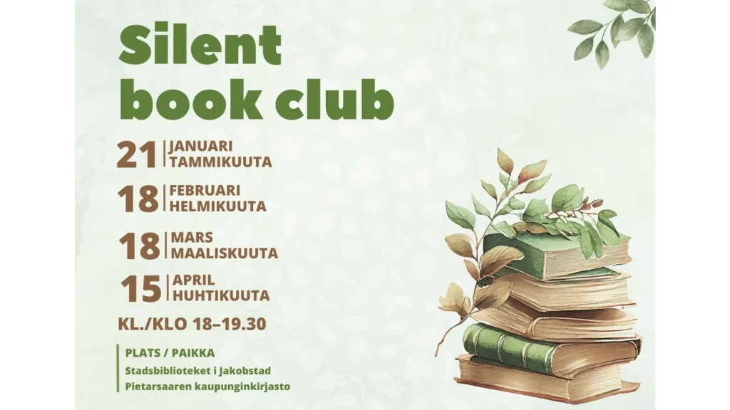 Vill du ha lugn och ro för läsning? Kom till Herkules-rummet i stadsbiblioteket och njut av en timmes tyst läsning i gott sällskap. Vi börjar med en kort pratstund och sedan kan du läsa din egen bok eller välja en på plats.