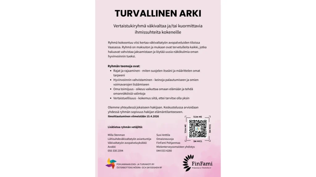 Ilmoittautuminen viimeistään 15.4.2026. Olemme yhteydessä jokaiseen hakijaan. Keskustelussa arvioidaan yhdessä ryhmän sopivuus hakijan elämäntilanteeseen. Ryhmäntapaamisten ajankohdat ilmoitetaan osallistujille.
