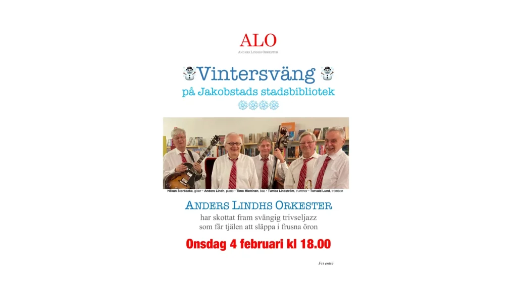 ONSDAGEN DEN 4 FEBRUARI KL 18.00 brakar 2026 års Vintersväng loss – den här gången på Jakobstads stadsbibliotek med fri entré. ALO har fått dispens från regeln att det ska vara tyst på ett bibliotek.