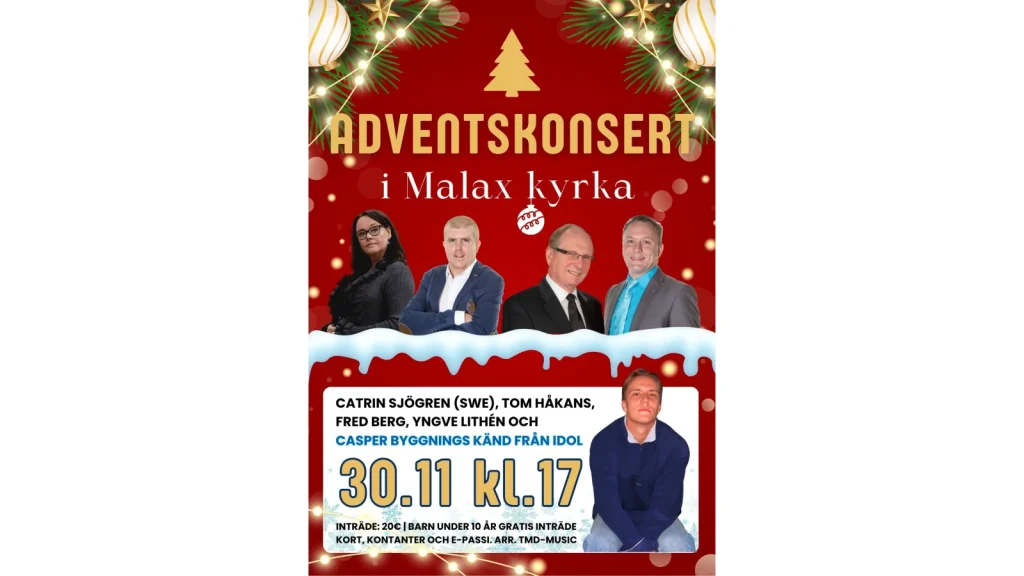 Välkommen in i värmen och gemenskapen på en stämningsfull och mysig adventskonsert som innehåller allt vad beträffar repertoar och olika musikstilar med några av Svenskfinlands mest folkkära artister. Med oss på denna adventskonsert får vi återse publikfavoriten från ifjol, Catrin Sjögren som nu återvänder till Österbotten. Gästartist: Casper Byggnings som är ”Känd från Idol 2025”
