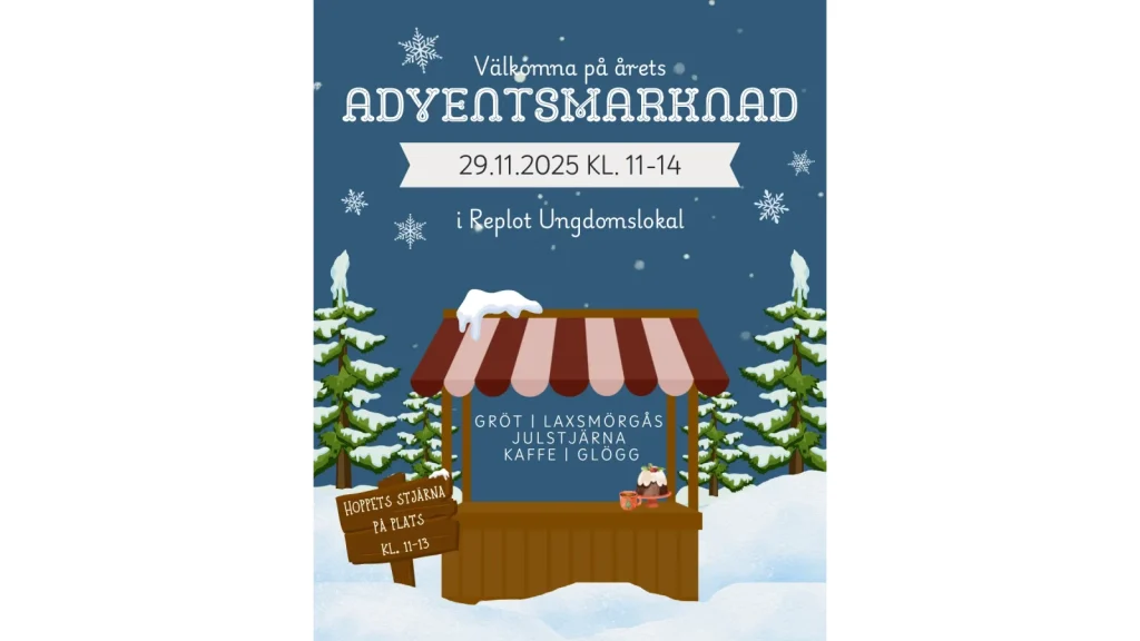 Kom i julstämning tillsammans med oss i Replot! Årets adventsmarknad i Replot UF går av stapeln lördagen den 29.11.2025, kl. 11-14 i Replot ungdomslokal (Byhamnvägen 94). Replot UF ordnar servering med risgrynsgröt, laxsmörgåsar, jultårtor, kaffe och glögg. Replot marthaförening ordnar snabblotteri. Många härliga produkter finns till försäljning av flera olika försäljare och lokala föreningar, bl.a. säljs fårskinn, kött och fisk, bakverk, hudvård och andra hantverk. Hoppets stjärna är på plats vid ungdomslokalen kl. 11-13 och tar emot donationer och julpaket. Hjärtligt välkomna!