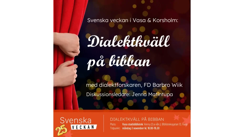 Hör dialektforskaren, FD Barbro Wiik berätta om de österbottniska dialekterna och den österbottniska dialektrenässansen ur forskarens synvinkel. Därefter: Böcker om och på dialekt – utställning. Kvällen avslutas med deltagarnas egna berättelser om dialektupplevelser.