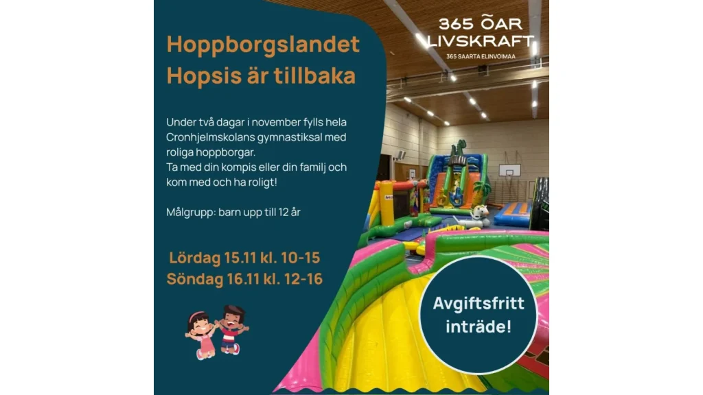 Hopsis kommer till Larsmo 15-16 november och fyller hela Cronhjelmsskolas gymnastiksal med deras häftiga hoppborgar.