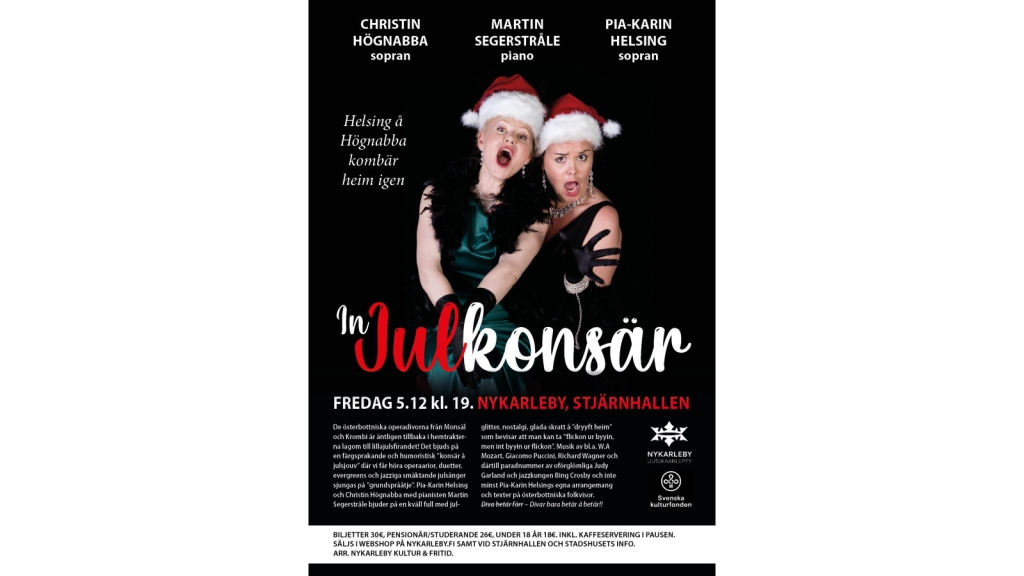 De österbottniska operadivorna bjuder på en färgsprakande och humoristisk konsert och julshow med operaarior, duetter, evergreens och jazziga smäktande julsånger på ”grundsprååtje”. Med sopranerna Christin Högnabba, Pia-Karin Helsing samt Martin Segerstråle på piano.