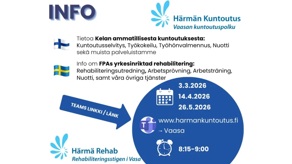 Lyhyt infotilaisuus Vaasan kuntoutuspolun palveluista ja miten voit hakea tai ohjata asiakasta. Tilaisuuteen ei tarvitse ilmoittautua ja se on auki kaikille kiinnostuneille. Saat tilaiuudessa myös tietoa kuntoutusrahasta ja Härmän kuntoutuksen muista kuntoutusvaihtoehdoista Vaasassa ja Mustasaaressa.