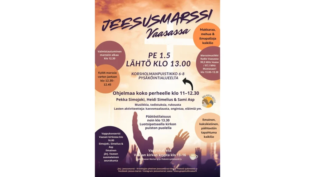 Jesusmarssi Vaasassa 1.5. Kaksikielistä ohjelmaa klo 11-12.30 Korsholmanpuistikko 6-8 P-alueella. Marssi alkaa klo 13.