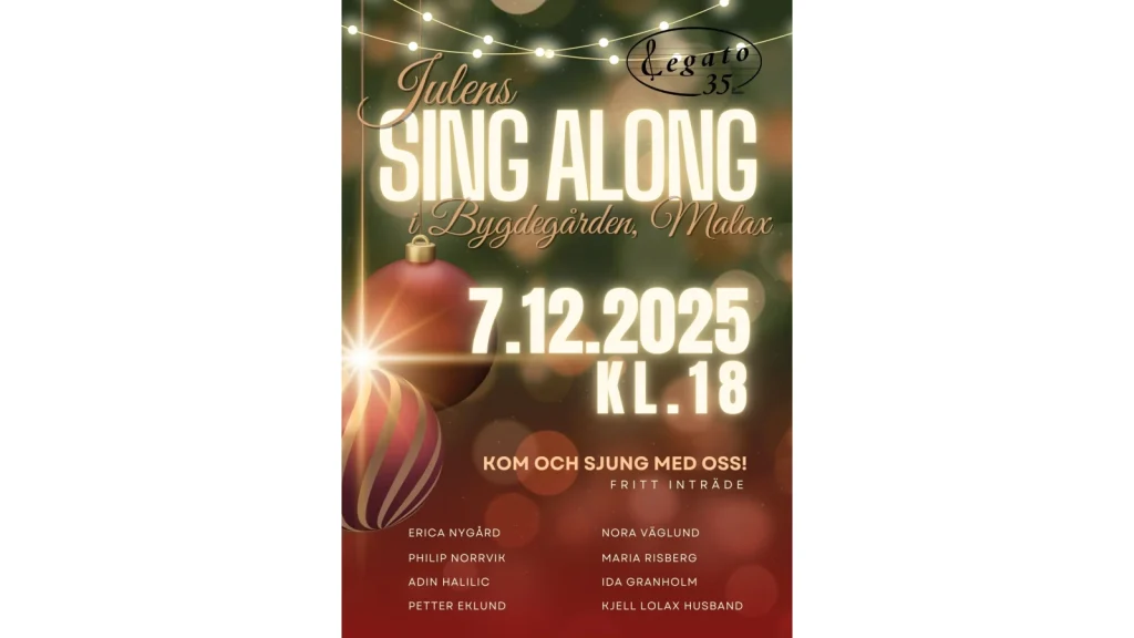 Den 7 december kl. 18 fylls Bygdegården i Malax av värme, gemenskap och julstämning när vi bjuder in till julens Sing along konsert. Evenemanget är helt gratis, och alla är välkomna med!