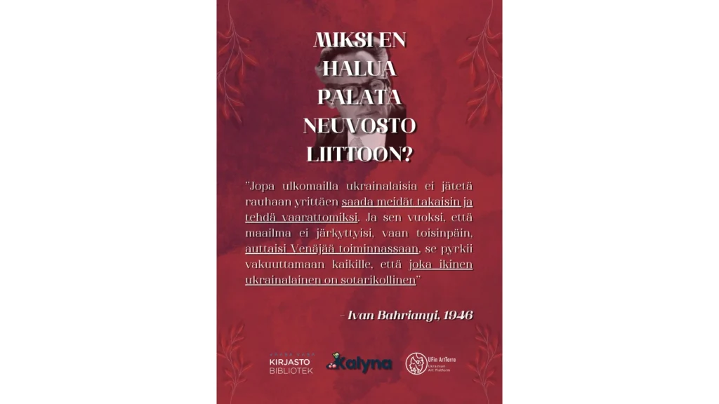 Ei, se ei ole nykyistä ukrainalaista problematiikkaa. Se on vuonna 1946 kirjoitettu artikkeli, jossa ukrainalainen Nobel-palkintoehdokas Ivan Bahrianyi ensimmäistä kertaa historiassa paljasti Neuvosto-Venäjän sotarikoksia ukrainalaisia ja muita kansoja vastaan kansainväliselle yleisölle. Artikkeli ”Miksi en halua palata Neuvostoliittoon?” kertoo venäläisen miehityksen todellisuuden silminnäkijän muistoin samanaikaisesti valottaen nykyisen sodan luonteen sekä motivaation ukrainalaiselle vastarinnalle.